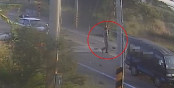 從另一個角度看,黑色轎車當時跨越雙黃線,闖到對向車道,機車騎士載女乘客閃避不及,當場撞上,騎士往前彈飛,後座女乘客則被猛烈撞擊,拋飛車外,車子零件當場散落一地,連安全帽都噴飛,可見當時撞擊力有多大。