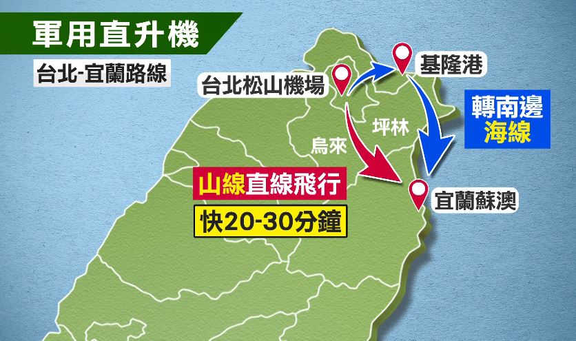 這次黑鷹直升機迫降意外,外界也好奇,明明有海路能走,為什麼會選擇複雜度相對高的山路呢?不過軍事專家也分析,兩條路線單趟就差了20分鐘,因此只要天氣狀況允許,都會選擇比較快的山路。而這次發生迫降的路線,也跟1995年11月的失事軍機路線很相似,都是從台北松山機場飛往宜蘭,1995年時在三貂角附近失聯,造成三人罹難。