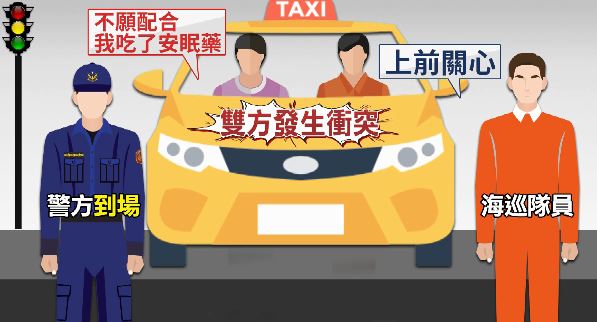 安瀾橋派出所所長黃建中:「經同仁到達調查(處理),發現一男子昏睡於計程車上,叫醒該男子 請其出示證件,在男用包內發現稀有違禁物品,當場與民眾及海巡署岸巡隊員,合力將男子制伏。」
