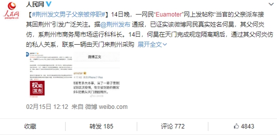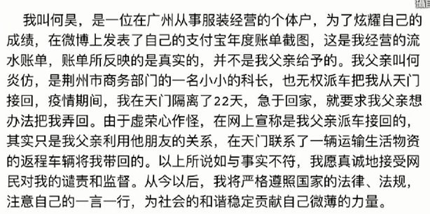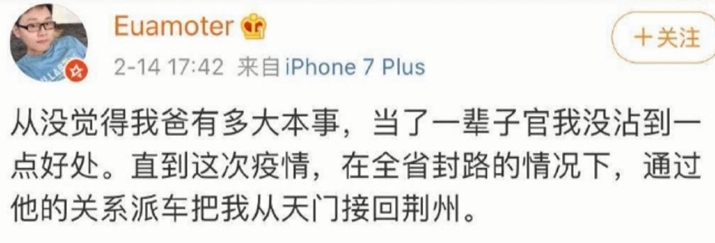 囂張的官二代不只一個,大陸荊州這名叫何昊的男子,14號在微博發文,說從沒覺得我爸有多大本事,直到這次疫情,全湖北省封路狀況下,透過關係把我從天門接回荊州,還附上圖片佐證,讓大陸網友群情激憤,肉搜何昊,事後他本人道歉回應,說父親只是荊州小科長,是自己虛榮心作祟,才宣稱爸爸派車接他回家,之後傳出他父親已經遭到停職,網友還kuso創立標籤,就叫你爹可能要大意失荊州了。