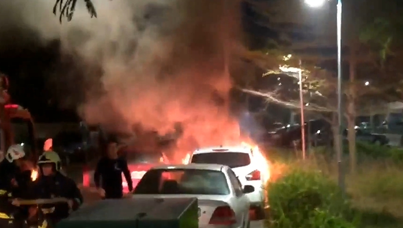 警消利用強力的水柱滅火後,細檢視白色的自小客車,車頭引擎部份碳化嚴重,車窗玻璃爆裂,內部塑膠裝備融化,現場還有汽油味,而一邊紅色自小客車頭也被大火燒毀,車上還留有一小桶的汽油,白車女車主看到愛車被燒毀,又氣又焦急通知朋友趕來幫忙,遭警方勸離。