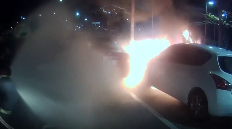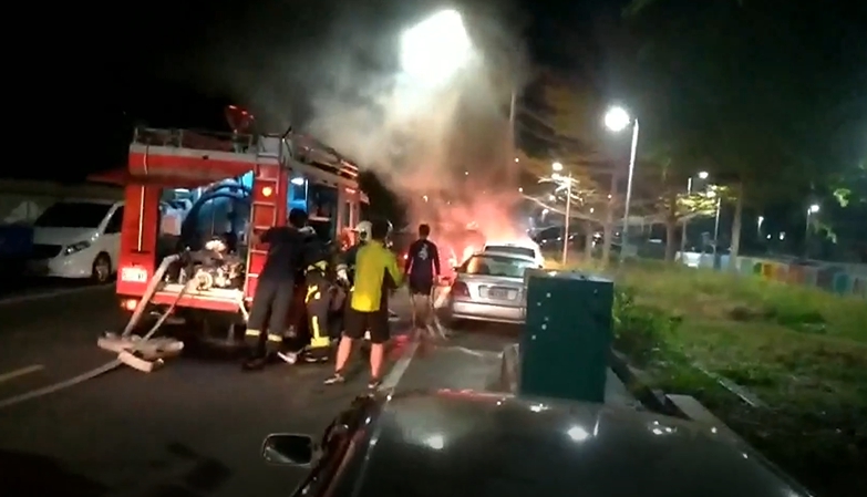警消:「XXX呼叫你先回答,現場有二台自小客車,自小客車起火燃燒,目前撲滅當中。」