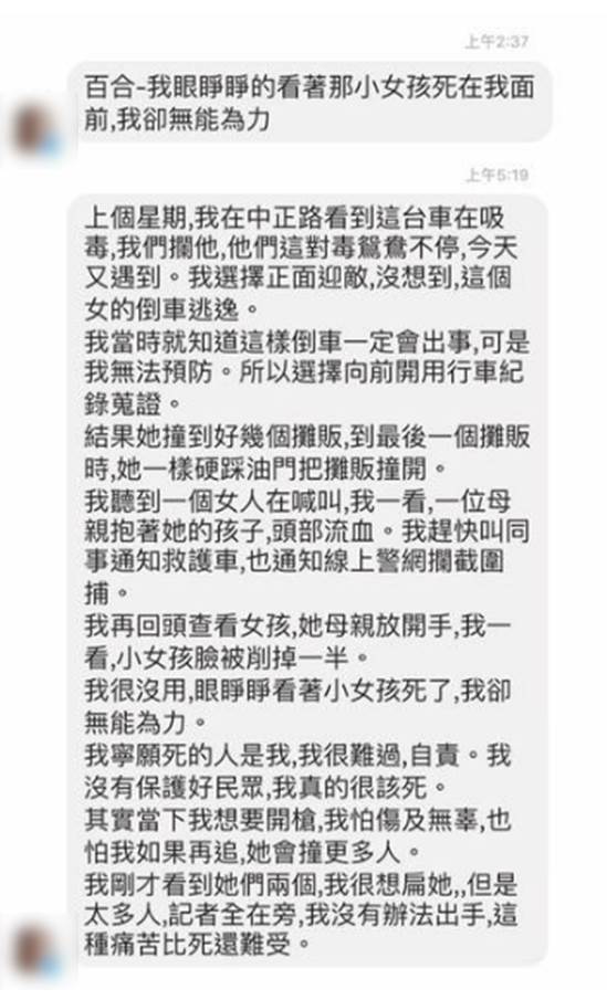 員警,透過臉書訊息傳文至台南市警眷谷百合的臉書。文中寫著:看到一對毒鴛鴦正要攔檢,殊不知女的倒車逃逸,到最後一個攤販時,我聽到一個女人在喊叫,一位母親抱著她的孩子,頭部流血,小女孩臉被削掉一半,我很沒用,眼睜睜看著小女孩死了,我卻無能為力;我寧願死的人是我,我很難過,自責。我沒保護好民眾,我真的很該死,其實當下我想開槍,我怕傷及無辜,也怕我如果再追,她會撞到更多人。