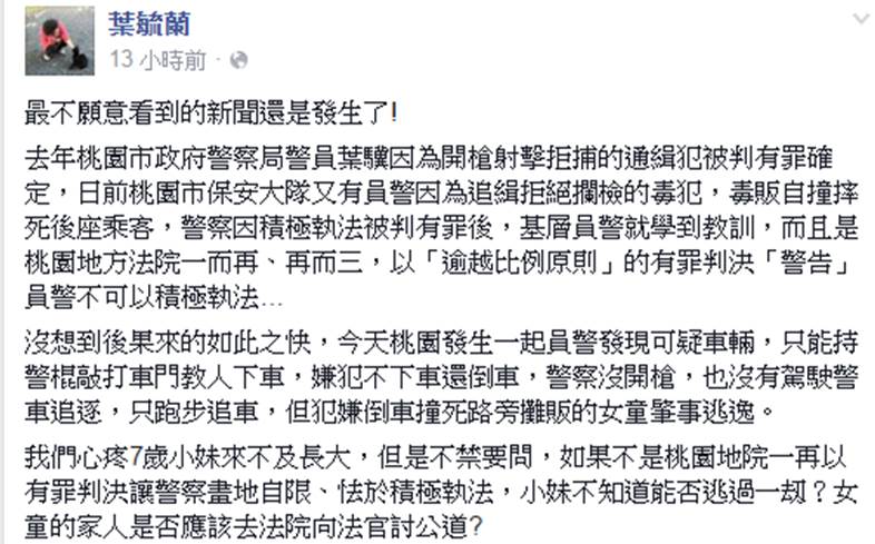 警大教授葉毓蘭也在此事件發生後,在臉書貼文,指出警察因積極執法被判有罪,基層員警受到教訓,而且是桃園地方法院一而再、再而三,以「逾越比例原則」的有罪判決「警告」員警不可以積極執法。我們心疼7歲小妹來不及長大,卻因為桃園地院一再以有罪判決讓警察畫地自限,受害者家屬是否應該向法官討公道?
