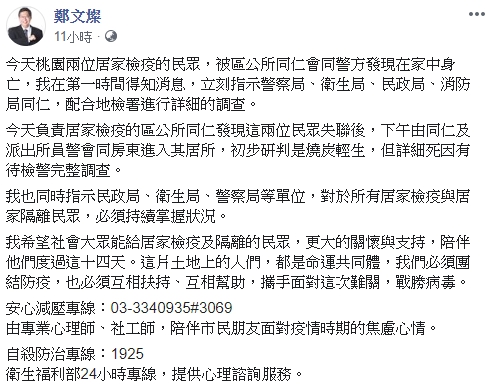 ▼桃園市長鄭文燦在臉書表示,目前初步研判為輕生。(圖/翻攝自鄭文燦臉書)