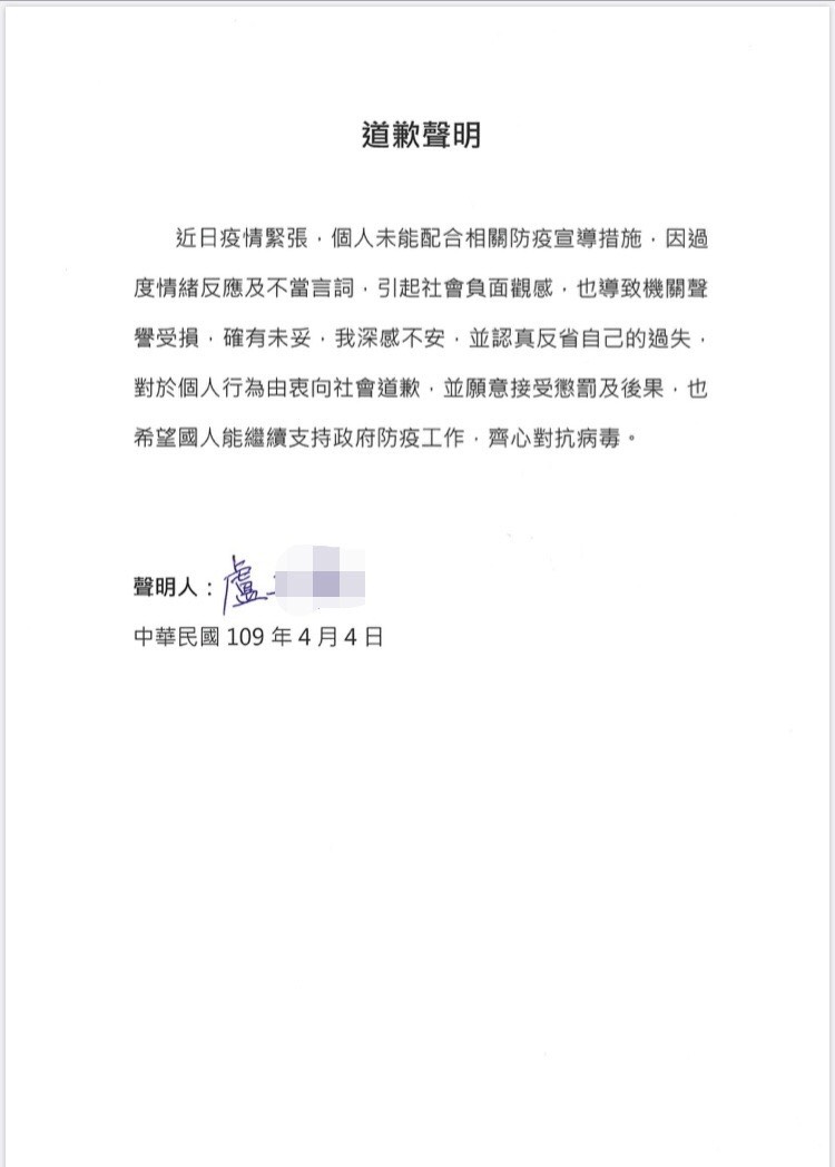 健保署今晚轉發該名醫管組盧姓業務助理的道歉聲明,內文提到除了為過渡情緒反應及不當言詞,引起社會負面觀感,導致機關聲譽受損道歉外,也表示願意接受懲罰及後果。盧姓業務助理最後強調:「希望國人能繼續支持政府防疫工作,齊心對抗病毒」。