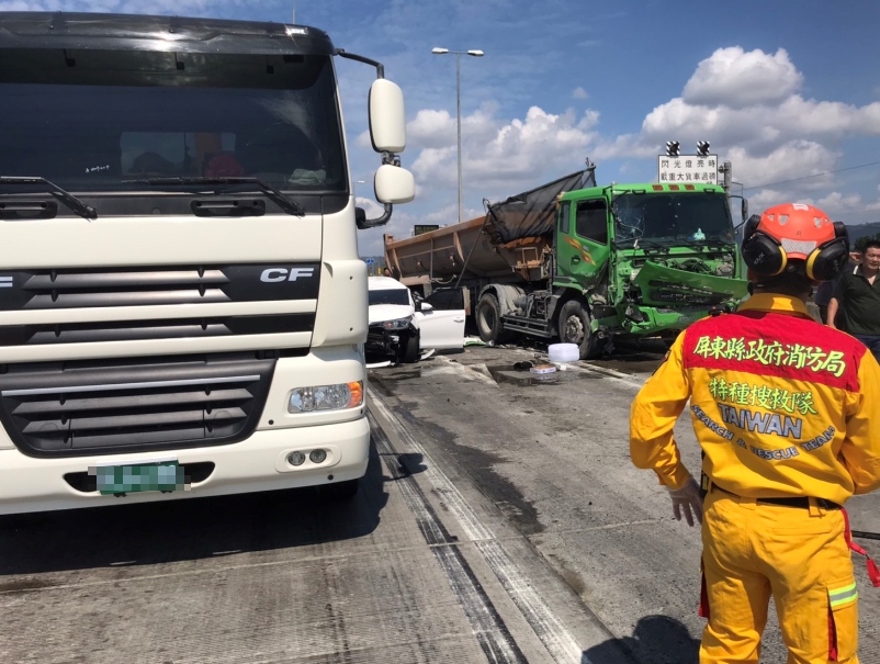 屏東里港鄉發生車禍!屏10線青龍寺附近於今(2)日發生連環車禍案,現場有4輛砂石車及2輛自小客車追撞事故,當時一度有2名乘客受困,經過搶救後,總共8人(5男3女)分別送義大旗山醫院,目前並無生命危險,正在醫院醫治中。