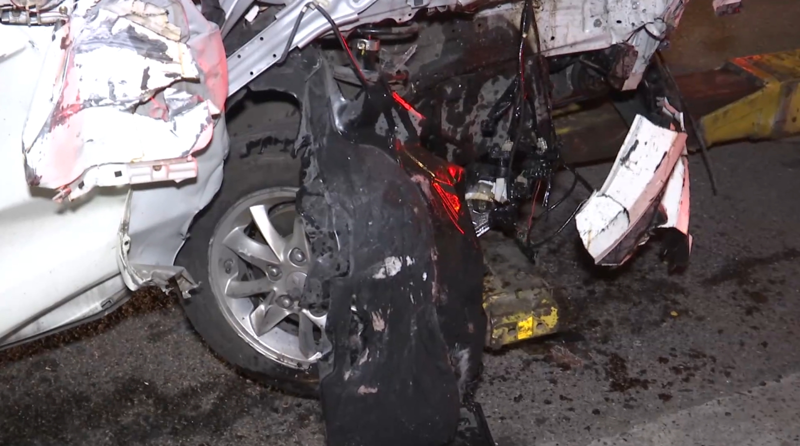 白色轎車,車頭嚴重凹陷,擋風玻璃全毀,零件四散一地,幾乎看不出原來的模樣,再往車裡頭看,安全氣囊全都爆開,情況慘烈,可想當時撞擊力道有多猛烈,台北市14號晚上,發生一起車禍意外,整輛車撞進騎樓裡,附近民眾聽到聲響,趕緊跑出來查看 。