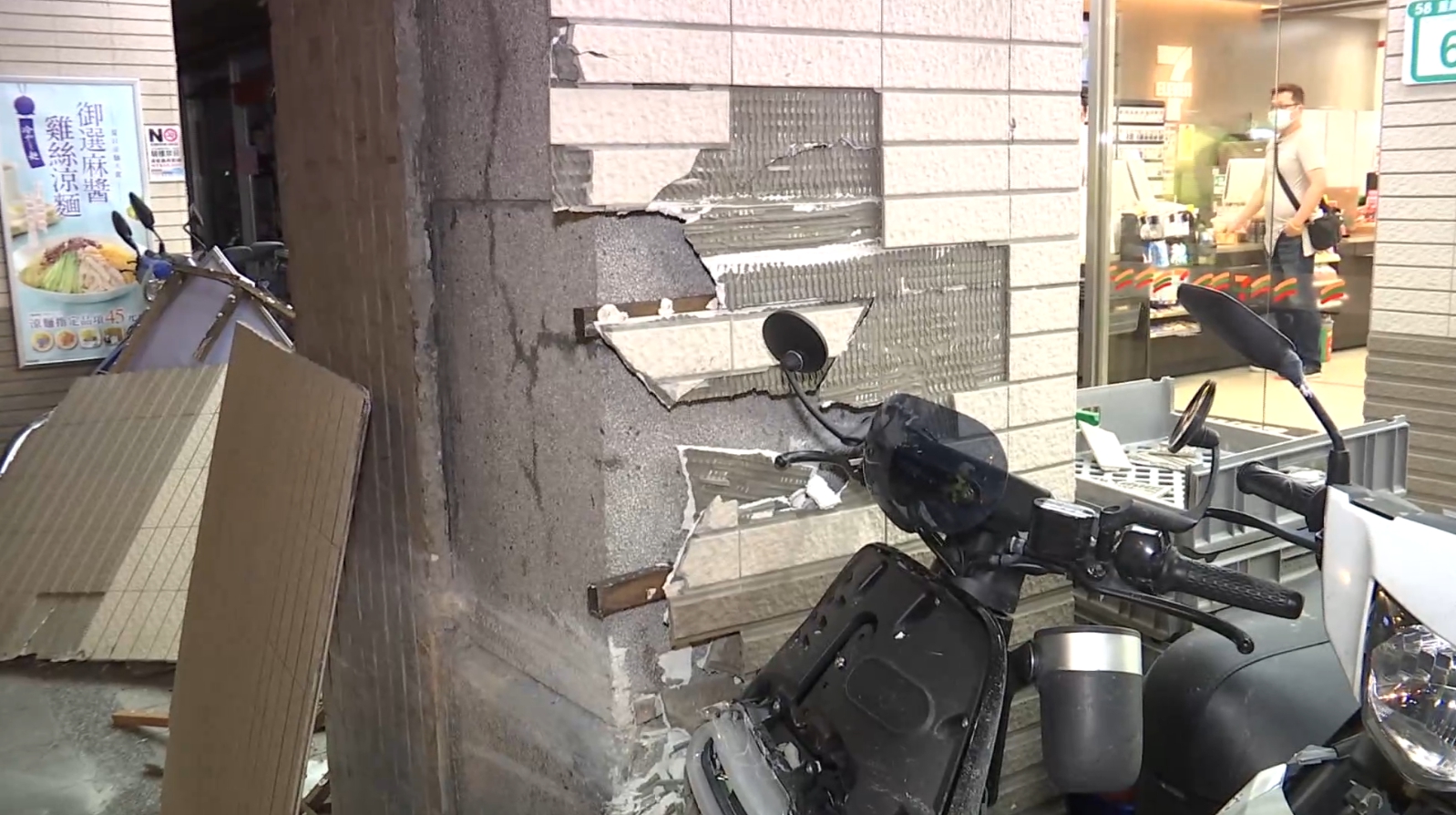 ▼超商外騎樓的招牌、柱子被撞毀。(圖/東森新聞)