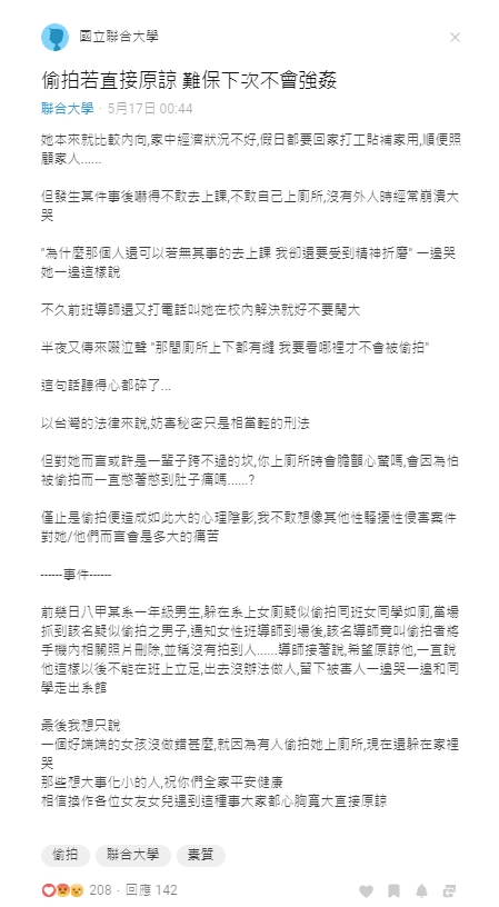 有媒體報導,聯大一名男大生在校內女廁疑似以手機偷拍女同學如廁,當場被發現,班導師獲知到場後,以沒拍到人為由,叫男學生把照片刪除,並希望被害女學生原諒,導致女學生身心受創;事後有別系學生上網PO文,質疑導師欲息事寧人、涉嫌包庇。