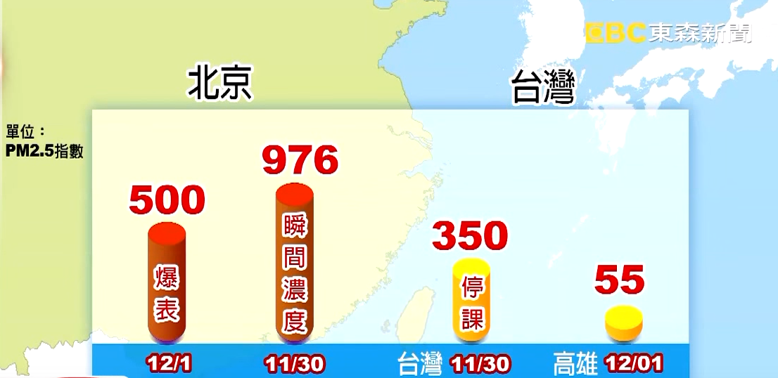 這是今年北京最嚴重的霧霾,一號下午偵測的PM2.5濃度,已經超過500微克,但前一天還一度衝到976,數值讓人吃驚,因為在台灣PM2.5超過350,就已經達到停課標準,而同時間高雄的PM2.5濃度,也才只有55微克而已。空氣如此惡劣,大陸網民只好苦中作樂,把電影陰屍路的場景拿來描繪比京。
