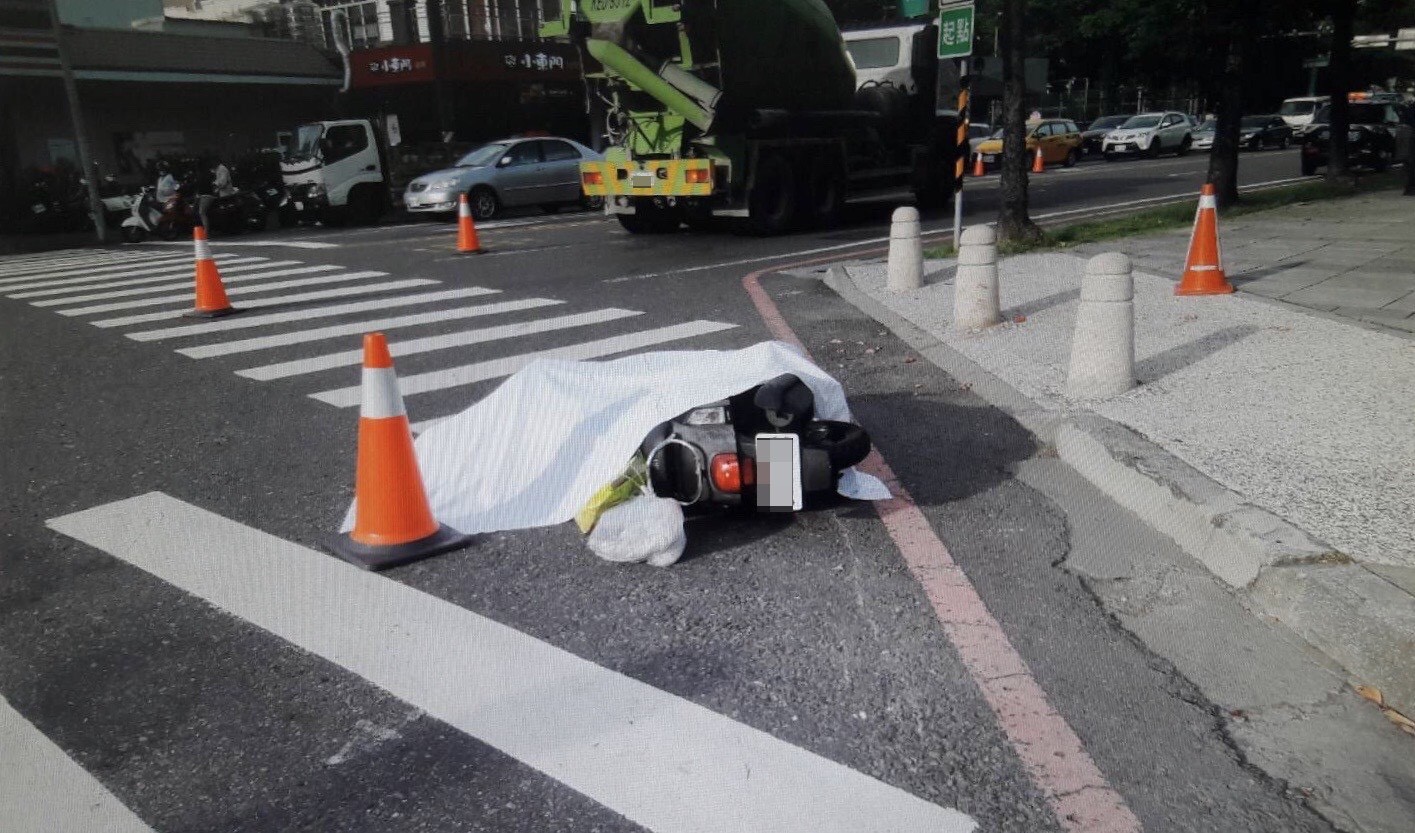 台南市中西區中華西路、府前路口今天下午發生一起死亡車禍,一輛預拌混凝土車和機車疑似擦撞,女騎士被輾壓,頭骨破裂,腦漿溢出,當場死亡。