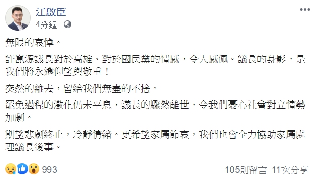 ▼江啟臣在臉書發出哀悼文。(圖/翻攝自江啟臣臉書)