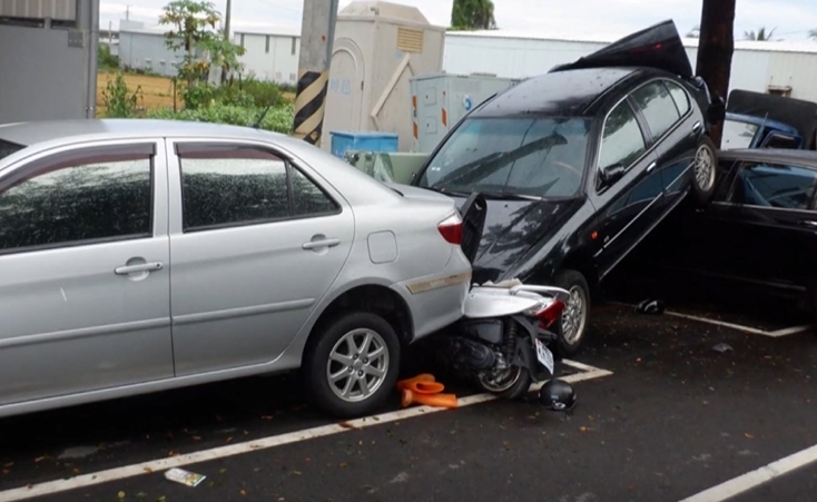 台中市大里區在10日清晨五點多發生連環追撞事故,40歲的邱姓男子開著租來的千萬賓利,失控衝撞停在路旁的3台車,其中一台車尾被賓利整個鏟起來,車頭往前推撞另一輛銀色轎車,害一名無辜的83歲騎士慘遭夾擊、雙腿骨折,幸好送醫治療,沒有生命危險,肇事駕駛沒有酒駕,供稱是為了閃東西才撞車,不過詳細原因有待警方釐清。