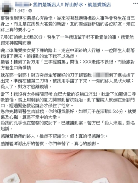 遭刺的孫男在臉書社團貼出自己住院的照片還原真相,當時他正要去接女兒下課,行經中正路騎樓時突然迎面撞上一名男子,對方馬上狂飆髒話,兩人因此發生衝突,「就在那一剎那,對方突然拿藏好的刀子,朝我刺了進去」,孫男心有餘悸,所幸在對方準備再次攻擊時,一旁民眾見狀大聲呼救,嫌犯才趕緊逃離現場。