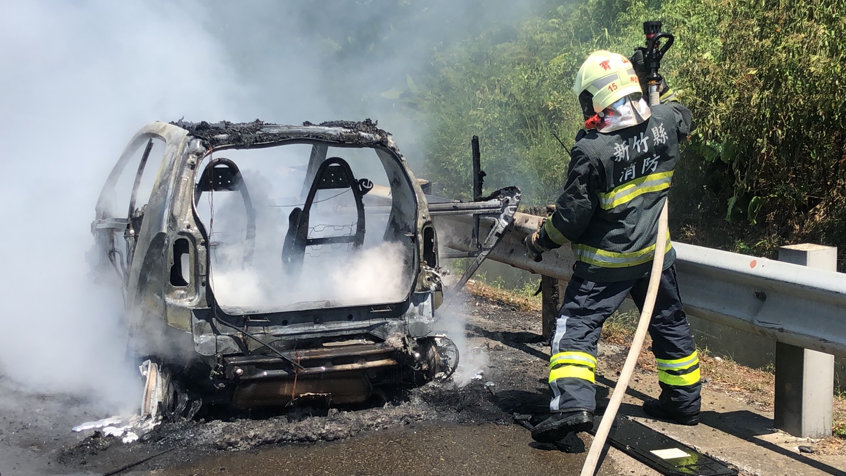 黑色濃煙從轎車上竄出,幾乎遮住一個車道,在熊熊烈火不斷燃燒下,白色Smart被燒到幾乎只剩下骨架,今國道3號下午1點多傳出火燒車意外,消防車獲報後趕到現場佈水線灌救,迅速將火勢撲滅,起火轎車燒到只剩下骨架,一旁還有許多員警在指揮交通,及時脫困的駕駛表示,這台起火白色Smart是今年三月買的中古車,除了近期冷氣有部分狀況,其他都沒有異狀,至於為什麼開一開會突然起火燃燒,自己也很困惑,詳細原因還要等警方釐清。
