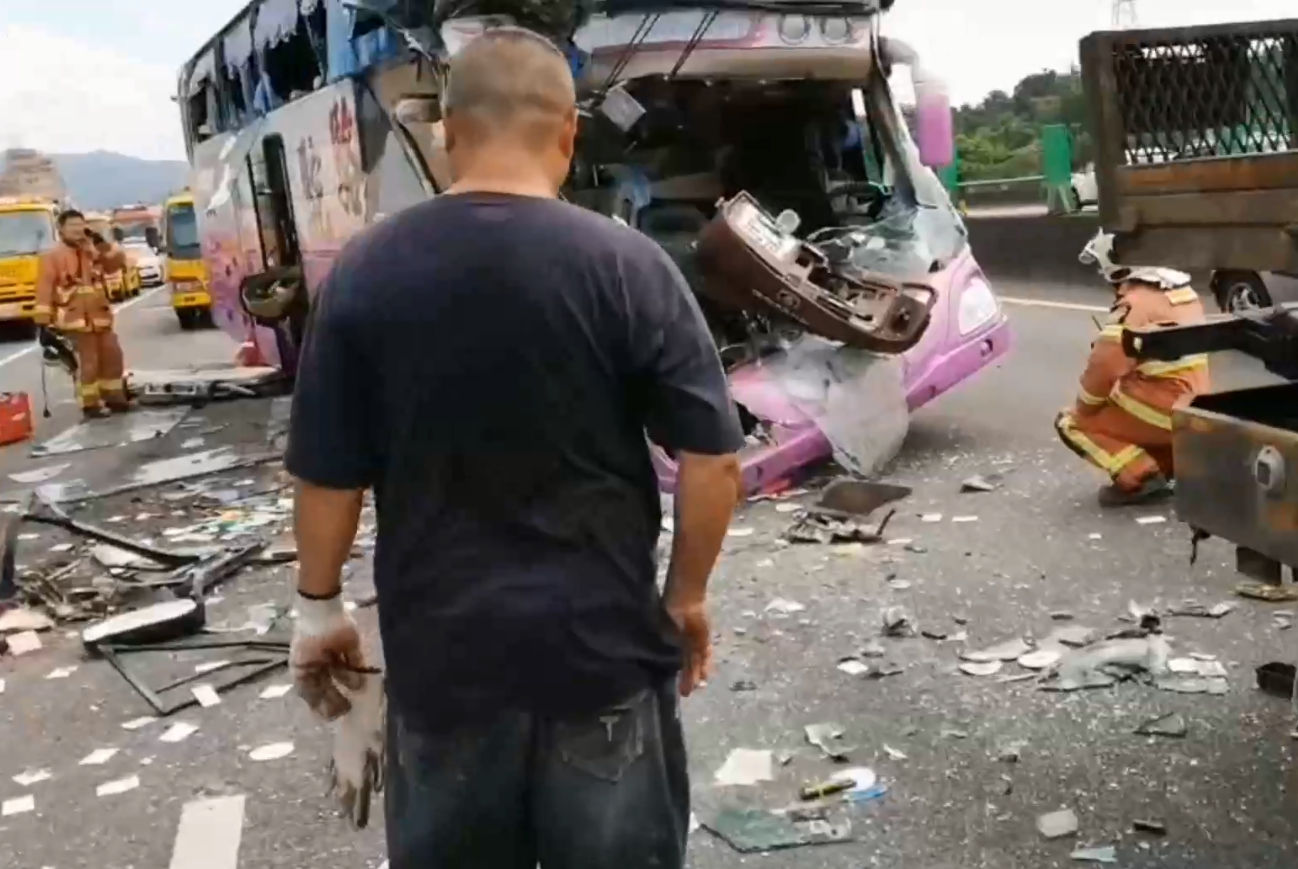 據了解,這起死亡車禍疑似因未保持安全車距所致,車禍現場一片混亂,車體零件散落一地,其中更參雜著許多旅遊DM,原來這台駱駝客運載著40多位遊客要前往太平山一日遊,清晨6點多從基隆出發後,到汐止換車沒多久就不慎撞上前方另一台客運,強大撞擊力道造成1人死亡,18人輕重傷。