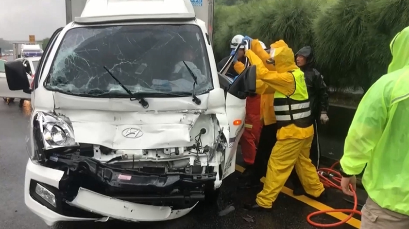國道3號南下144公里路段今天突然下起大雨,通霄交流道前後約500公尺,就傳出3起事故,總共11部車輛發生碰撞,其中1部小貨車駕駛一度受困,經送醫急救幸無生命危險。