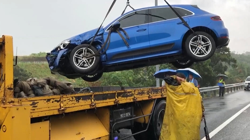 國道員警勘查事故,初步判斷可能天雨路滑,造成1輛保時捷打滑自撞外側護欄,導致5部大小車發生碰撞、車流回堵,後方車輛煞車不及,又分別引發2起、各3部車輛追撞意外。