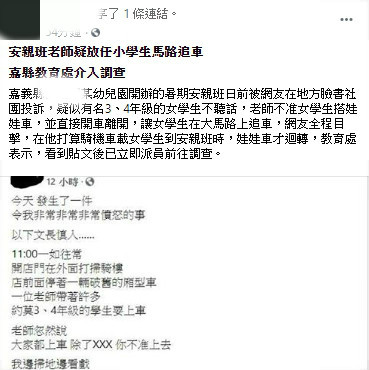 嘉義一位民眾在臉書社團發出一則貼文,說明近日看到一件令人傻眼的畫面,一輛安親班的車到附近的國小接放學的學生,沒想到安親班老師疑要處罰一位女學生,竟然不讓她上車,還放任這名學生在車後方追趕,事後請家人打電話到安親班關心,園方則表示當天並沒有看見女童,讓直擊這殘忍畫面的民眾感到非常憤怒。