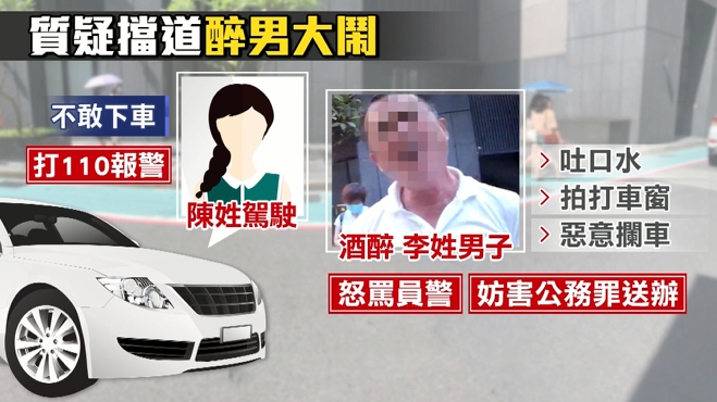 就怕撞到人,女駕駛的這一聲喇叭惹來麻煩,醉男吐口水、拍打車窗、惡意攔車樣樣都來,讓女駕駛嚇得趕緊報案,但警察來了男子依舊脫序,被依照妨害公務罪嫌,移送法辦。