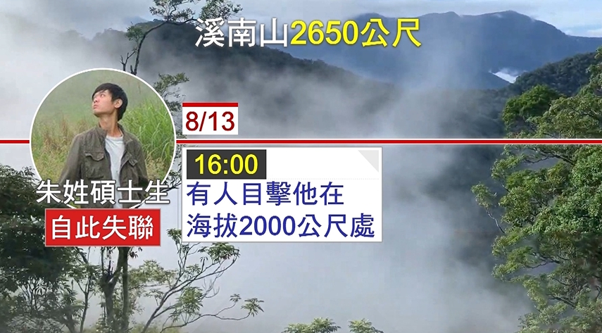 朱姓碩士生才剛從屏科大的植物醫學系畢業,為了採集昆蟲標本,十三日早上將近十點時,騎車進入高雄桃源雲山管制站,下午一點多他登上溪南山三叉路口時,還與另一名採集標本的人相遇,下午四點最後有人看到他的地方是在海拔二千公尺的山裏,從那時開始失去聯絡,原訂十三日晚上與他在藤枝特生中心會合一起下山的同學,等了一個晚上都等不到人,十四號報案,警義消搜山外同時出動空拍機在上空搜索,眼看天候不佳,救命時間也越來越急迫。