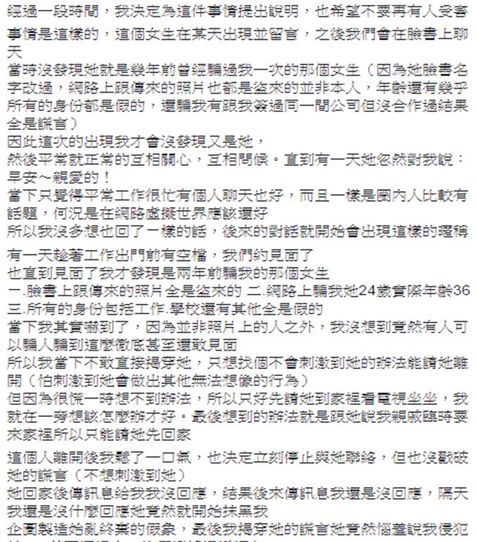 ㄧ.臉書上跟傳來的照片全是盜來的 二.網路上騙我她24歲實際年齡36 三.所有的身分包括工作.學校還有其他全是假的