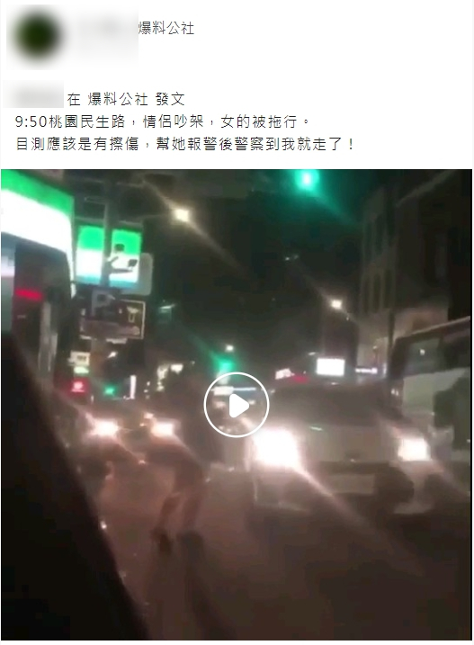 一名網友在「爆料公社」貼出影片,po文表示:「9:50桃園民生路,情侶吵架,女的被拖行。目測應該是有擦傷,幫她報警後警察到我就走了。」影片中可以看見一名黑衣女子擋在白色車輛前,當她走近副駕駛座時,駕駛催油門要跑,她一個箭步上前,不斷拍打車窗,甚至跟著車奔跑,最後更直接掛在車窗上,一路被拖行,還差一點被白車和停在路邊的車輛夾擊,最後她力氣用盡,直接摔在柏油路上,目擊民眾表示,女子腳都破皮了,場面相當驚險。