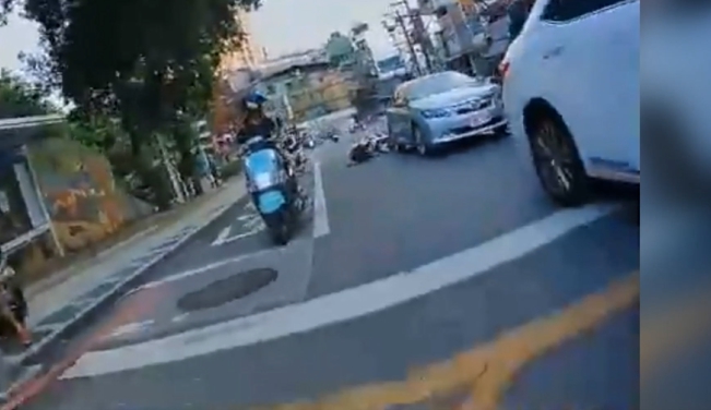 好幾輛機車剛右轉,只是仔細看,騎過來的這一名機車騎士,繞道靠近雙黃線的地方,疑似轉彎之後,還回過頭看了一眼,結果根本沒發現自己前方有轎車就撞了上去,這一撞,騎士飛起來再重摔在地,巨大的碰撞聲,旁邊另外兩名騎士也嚇了一大跳,也轉頭看了騎士。