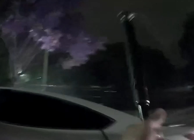 員警徒手槌打車門,駕駛仍不配合,擔心對方可能有武器,警方舉起警棍喝斥要他雙手舉高。