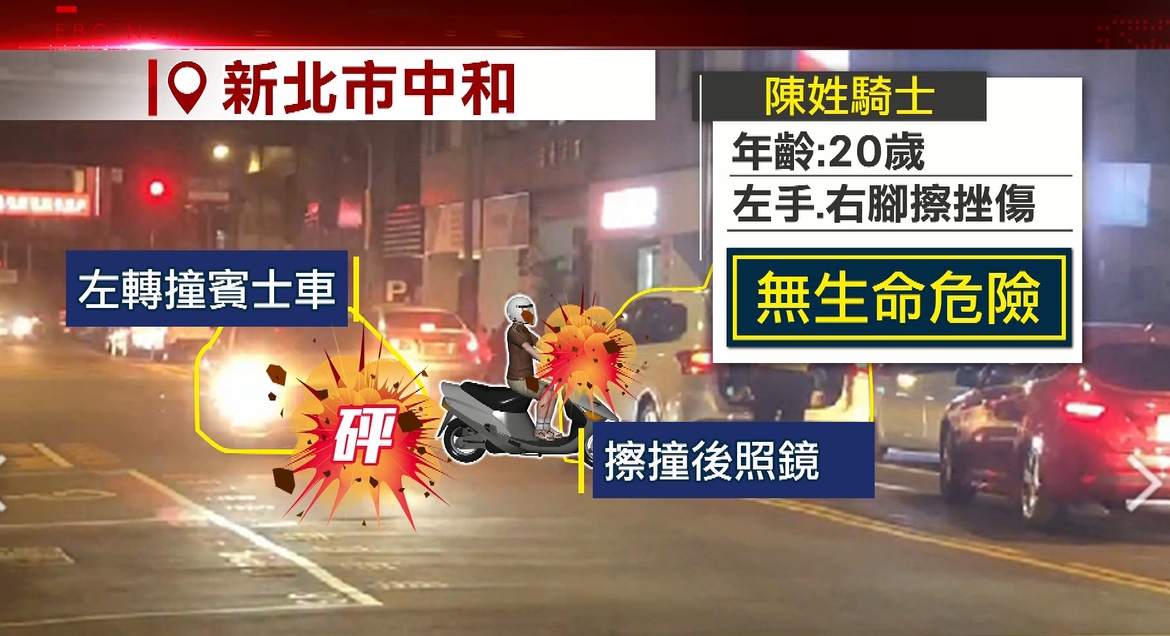 砰一聲發出巨響,讓所有人嚇壞,緊急通知警方到場,而賓士車駕駛和遭擦撞的白色轎車駕駛也立刻拿出三角警示牌,提醒其他用路人注意,整起車禍到底是如何發生的,事發在新北市中和,當時一名機車騎士,從停車場駛出後左轉,卻不慎撞上直行的賓士車駕駛,兩車發生碰撞後,機車騎士又撞到對向停等紅燈的自小客後照鏡,導致機車騎士左手右腳擦挫傷,還好送醫後沒有大礙,經過檢測後,駕駛酒測值為0,至於詳細車禍原因還得再釐清。