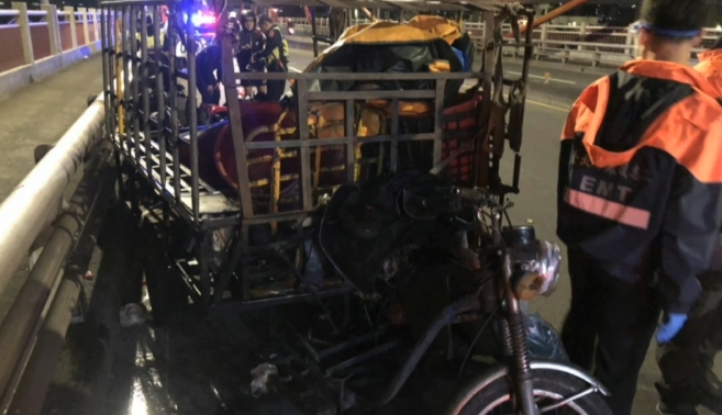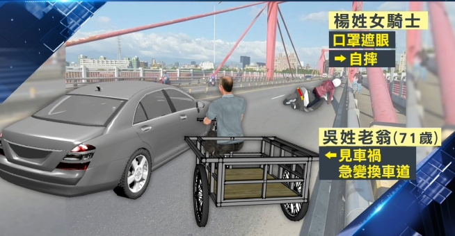 新北市板橋光復橋上昨日(30日)晚上發生一起驚險連環車禍,一名騎車的婦人因口罩被風吹到蓋到眼睛嚇到自摔,後面騎三輪車的老翁反應不及緊急變換車道,跟後方車輛發生車禍,過程中出現不少好心人協助,其中一人是剛下班的物流司機,附近店家得知他熱心協助,大讚暖心。