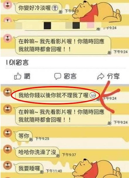 從原PO附上的對話記錄截圖中可見,男子幾乎照三餐傳訊給她,但原PO一句話都沒回,她以為這樣冷淡的態度已經十分明顯,但對方依舊繼續傳訊,讓她苦惱地直呼:「是不是我沒封鎖他,所以他覺得有機會?」。但有眼尖的網友卻發現了事情不單純,對話紀錄中夾雜著一句「我給妳錢以後妳就不理我了喔?」讓許多網友質疑:「應該是前面有發生什麼曖昧的情愫,讓男生覺得有機會了,結果突然被女方冷落 ,錢還像丟到水坑裡拿不回來」、「為什麼男生要給女生錢?」。