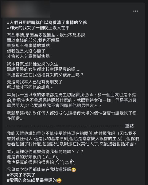 此篇文章因為引發諸多爭議,已被原PO刪除,她今天再次發文喊冤,「我就是太沒心機了,才會被人刻意模糊焦點」,她表示自己已經有男友,所以才不回對方訊息,「我一直以來都是男生想認識我也ok…我就是這樣對任何人都沒戒心。」她也說自己因為被網友酸言酸語狠狠哭了一整晚,「他是真的好煩很煩,我也是真的很害怕很害怕!」對於拿錢的部分則沒有多作解釋。