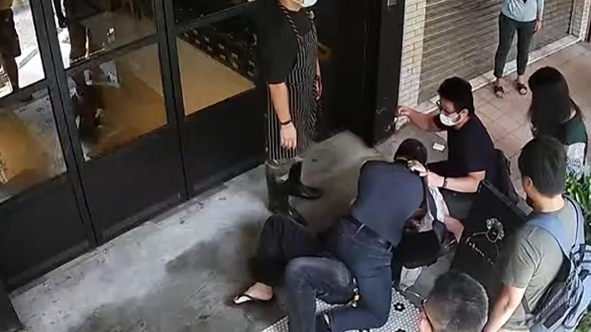灰衣男子和排隊客人扭打成一團,雙方騎樓開戰。