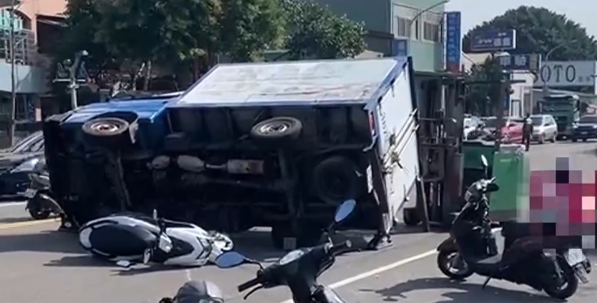 隨著死亡車禍事件曝光,台中警方也隨即調閱附近監視器查看,發現一共有4台機車在路邊停等,眼看沒車準備轉彎,沒想到一台貨車高速左轉衝過來,直接撞飛最前面兩台雙載的機車,騎士和乘客連人帶車摔了出去,四腳朝天,貨車整個翻倒在路中央,機車上其中一名女子被壓在底下,附近民眾被巨大撞擊聲嚇到,趕緊上前幫忙,還有人趕緊開來堆高機將貨車扛起。