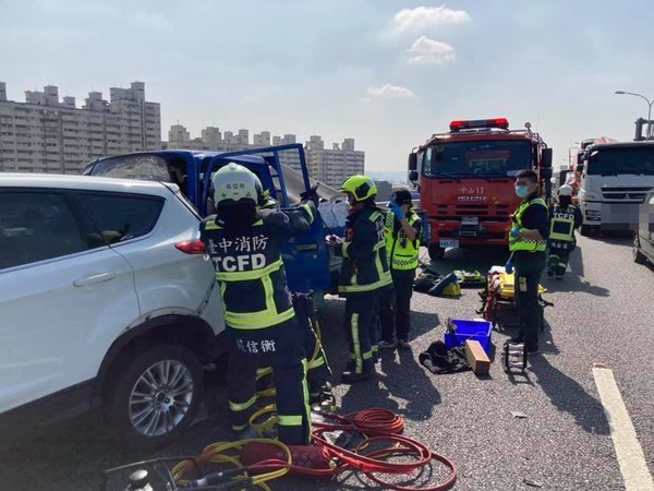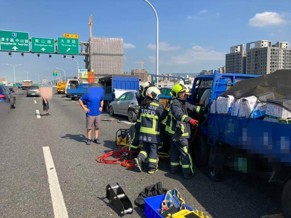 今(23日)上午10時許,警消接獲民眾報案,一名男駕駛報案稱開車不慎追撞前車、受困車內,趕緊到場處理,到場後發現有3名傷者,分別為一名60歲女性,有頭痛症狀,一名44歲女性,嘴唇受有撕裂傷,另一名則是報案受困的30歲男性,雙腳骨折,幸好3人皆意識清楚,目前已經被送醫救治。