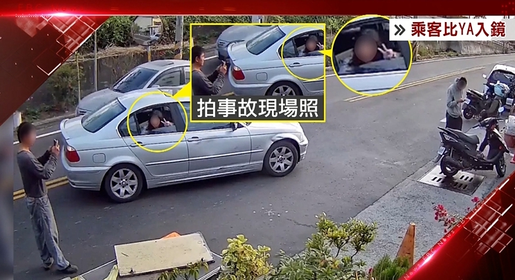 駕駛將遭撞掉的右後照鏡撿起來之後,就開了副駕車門拿手機,走到車子右後方,要拍照記錄事故現場,沒想到這手機才剛拿起來,後座疑似家人的一名女子,竟對著鏡頭比YA,笑得超開心。這時候男子接著,拍了數張事故現場照片,畫面曝光引發爭議,汽機車悚撞,雙載騎士乘客受傷,自小客乘客不顧騎士就在旁邊,開心比YA入鏡笑超開,比YA拍照後疑似被騎士發現,女子一秒轉頭和與騎士尷尬對看。