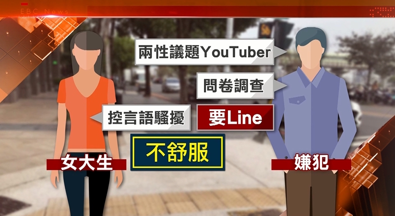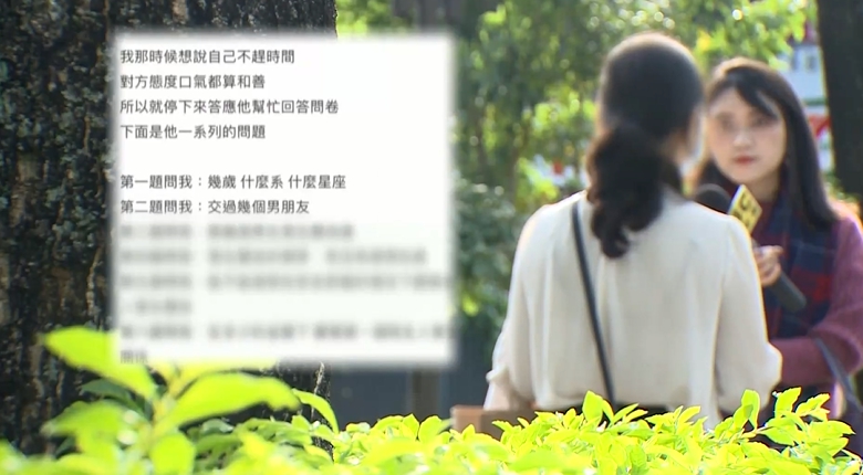▼中年男子表示自己是兩性議題的youtuber,想要做問卷調查,但問題卻相當奇怪,語帶騷擾,最後還向女大生要line。(圖/東森新聞)