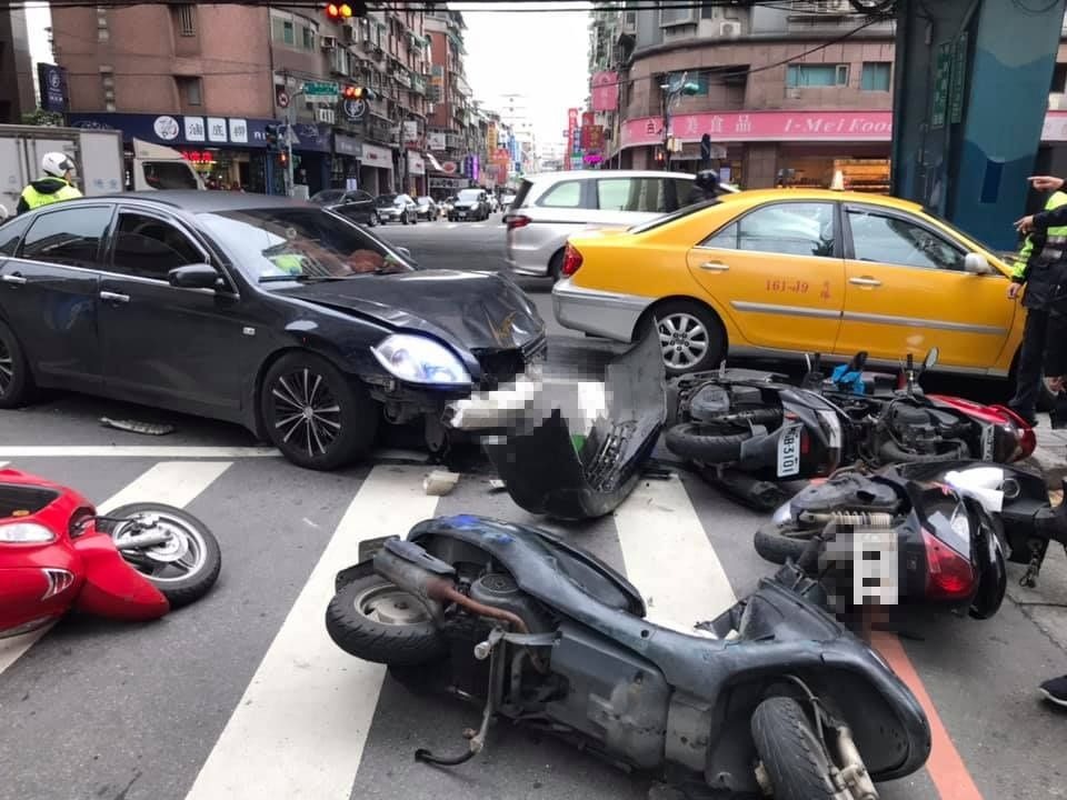 新北市三重新北大道一段,今(12)日12點半左右發生一起重大車禍,兩輛汽車以及五輛機車撞成一片,導致現場總共有七人受傷,警消獲報之後趕到現場,將這些傷患分送附近醫院救治,詳細肇事原因仍有待釐清。
