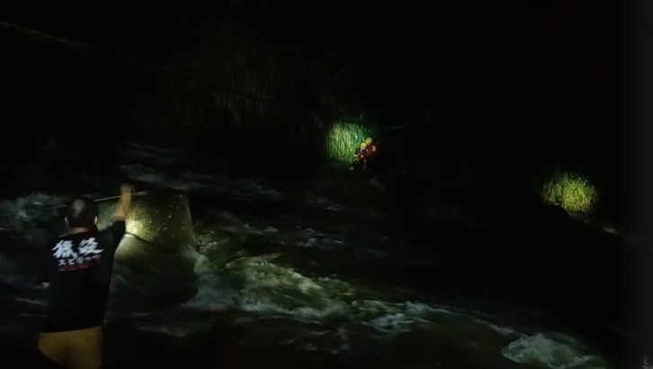▼搜救人員冒著湍急河流,搜尋遭溪水沖走的婦人。(圖/東森新聞)