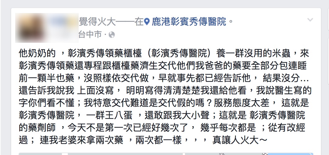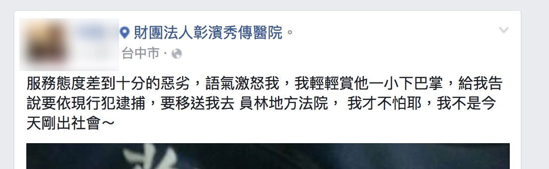 說(秀傳醫院)服務態度差到十分的惡劣,語氣激怒我,我輕輕賞他(藥劑師)一小下巴掌,給我告說要依現行犯逮捕,要移送我去員林地方法院, 我才不怕耶,我不是今天剛出社會~