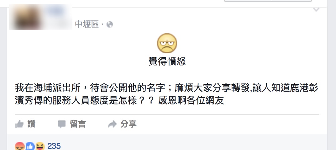 我在海埔派出所,待會公開他的名字;麻煩大家分享轉發,讓人知道鹿港彰濱秀傳的服務人員態度是怎樣?? 感恩啊各位網友。