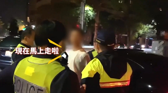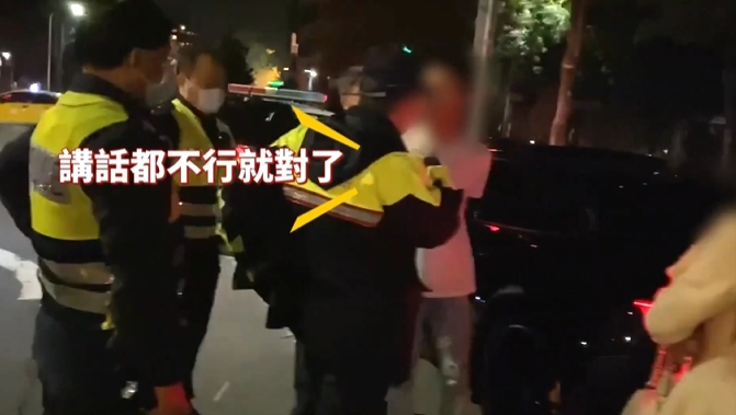 黃姓男子氣憤的說:「車放在這就好了啦,現在馬上走啦,到警察局等,走!」男子雙手被上銬,儘管被四名員警圍住,但他沒在怕,繼續嗆說:「隨便啦,講話都不行就對了。」
