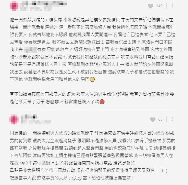 接著男子開始瘋狂表示自己要找人,還說原PO藏了人要闖進去,當時原PO告訴對方可以自己進去看,但男子卻堅持要她走進去,還堵在門口不讓她出去,所幸當時有其他人經過,原PO才逃了出來,接著男子開始失控吼叫,還狂踹原PO及別人的房門。