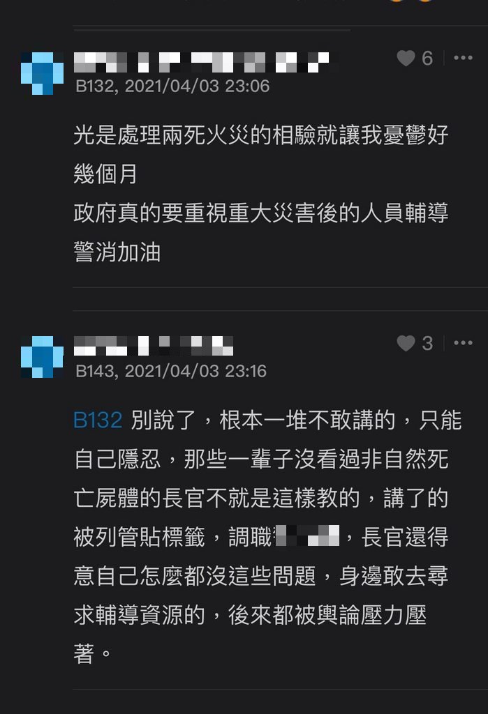 對此,有一名警消匿名指出,一堆人根本都不敢透露自己的心理狀況,只能私下隱忍,因為講了就會被列管貼標籤、調職等,身邊敢去尋求輔導資源的人,後來都被輿論壓力壓垮,「那些一輩子沒看過非自然死亡屍體的長官還會得意自己怎麼都沒這些問題」,去質疑對方是否抗壓性不夠。也因此不少網友紛紛呼籲,希望以後能擬定或是成立相關單位,不要再讓悲劇重演。