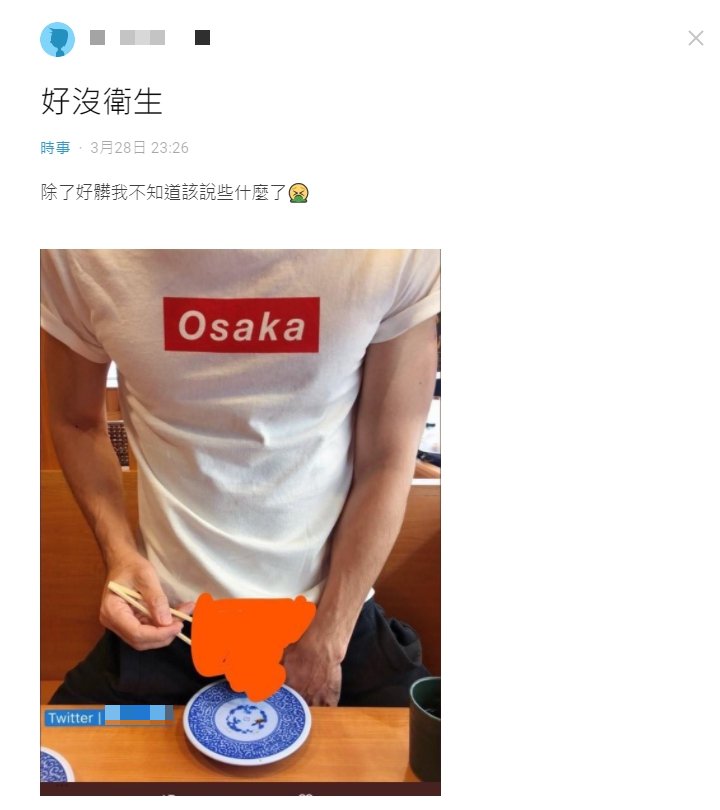 該名男網友日前在《Dcard》以「好沒衛生」為題發文,並附上了兩張截圖,只見一位男子雖然上身穿著整齊,但卻把下體裸露放在壽司盤上,並拍下照片放到他的推特。而他也說明整起事件的經過,原來是被人要求去戶政事務所改名為「我是真○被主人鎖到廢掉射不出來想吃鮭魚壽司的廢○一號奴尬許」。