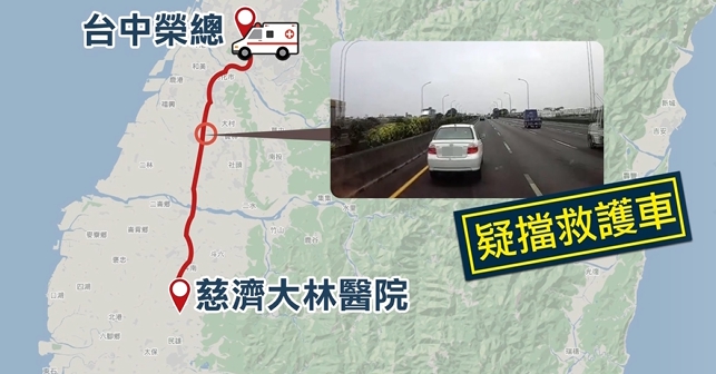 疑似擋救護車事件就發生在20日上午11點5分,這輛載著患者,要急著轉院的的救護車是從嘉義大林慈濟醫院出發,目的地是台中榮總,行經國道一道員林路段時,開在內線道,遇到白色轎車疑似擋救護車,長達三分多鐘,當時病患家屬就坐在副駕駛座,相當焦急。投訴民眾:「我有拉警報,就是請他讓開,還有閃燈,結果他也是不為所動,就是持續的開在內線車道,擋在我們救護車的前面。」、「連旁邊大車也一直在按喇叭,他也都不讓道,因為家屬剛好坐在副駕駛座,他也是在一直講說,為什麼大家都要讓,就你這台車不讓。」