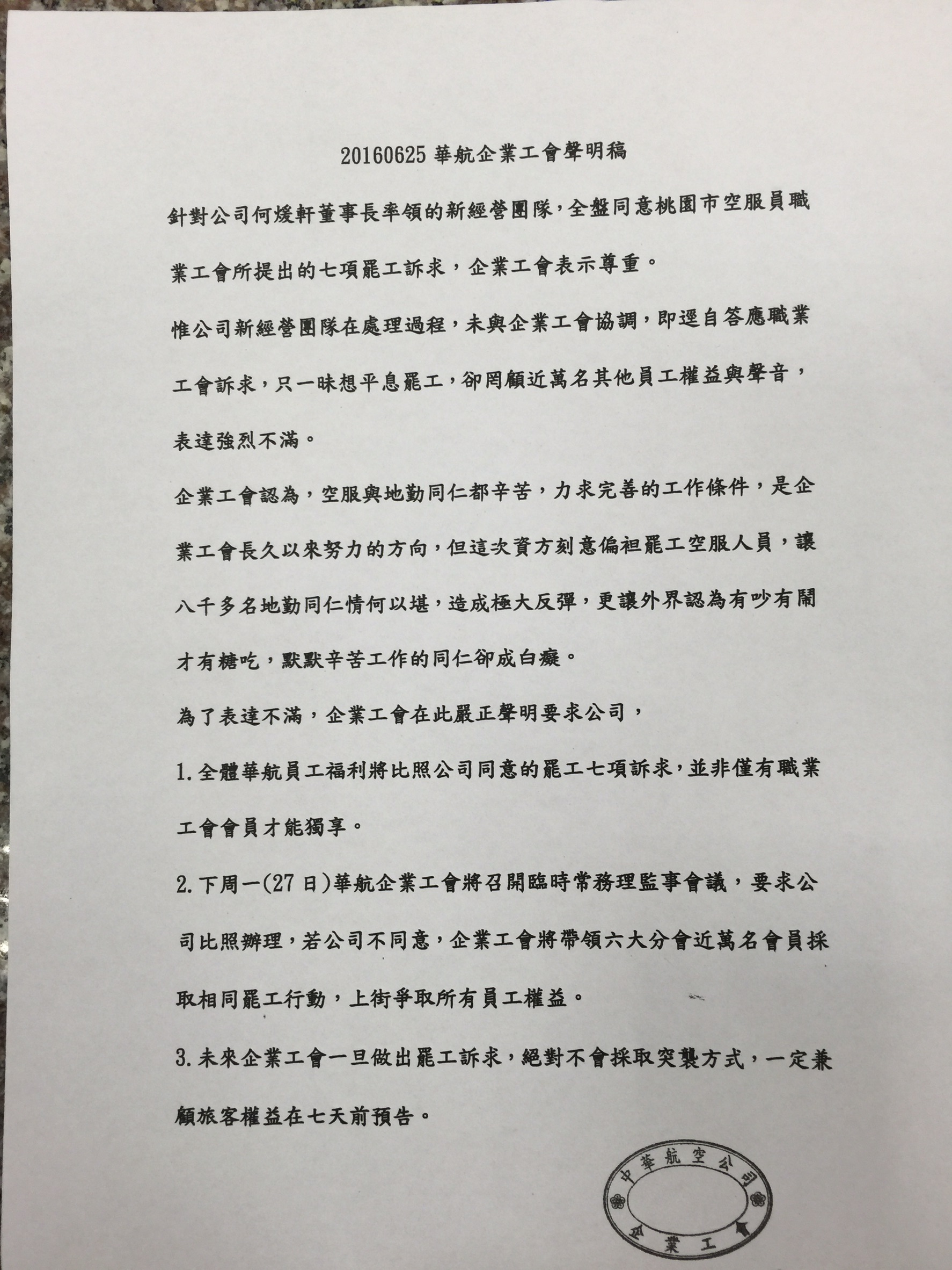 反撲。而今天華航企業工會決定在松山機場召開記者會,除了要求華航員工比照7項訴求,同時宣布下周一召開常務理事會議,否則6大分會上萬名會員也將上街罷工,會不會變成有空服員沒有地勤受理乘客報到的尷尬情況,罷工效應看來還在持續中!