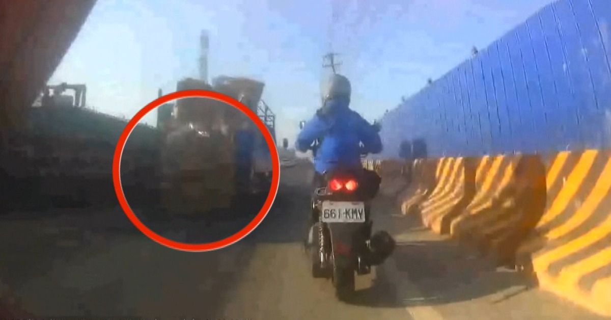 原PO附上的行車紀錄器影片,從畫面可以看到,貨車在行駛途中,放置在貨車底下的備胎脫落,直接砸向正在騎車的情侶,兩人當下的反應很敏捷,他們本來重心不穩的倒地,沒想到隨即又站穩,值得一提的是,男生在事發當下,立即抓緊女生的手並且查看她的傷勢,而不是先查看車子,所幸兩人只有輕微的皮肉傷,沒有大礙。